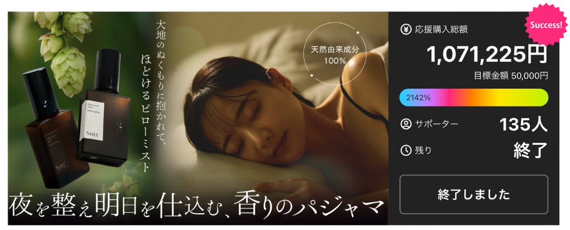 本製品は、2025年9月30日より応援購入サービス「Makuake」にて先行販売を実施し、目標比2142%を達成し、多くの共感と支持を集めたピローミストです。睡眠環境の質に寄り添う成分を含有した東北産ホップをブレンドし、木々の呼吸や草花のやさしさを感じる、まるで深い大地に抱かれるように自然をとじ込めた香りが特徴です。