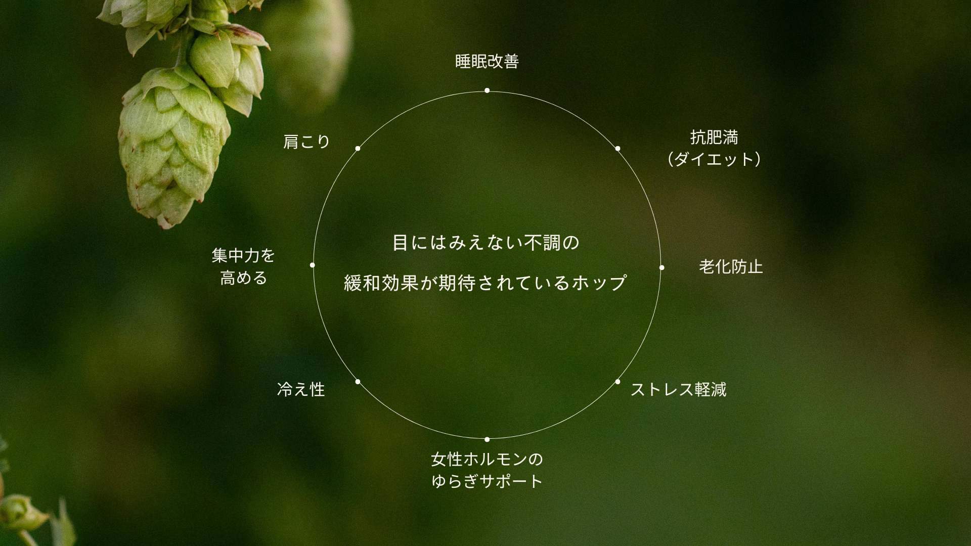 ホップには、フィトステロール、フラボノイド、アミノ酸、精油、苦味質など、さまざまな成分が含まれています。これらの成分は中枢神経に働きかけ、多彩な効果を発揮してくれる可能性を秘めていることが研究・学術論文でも明らかになっています。そうしたホップの香りをブレンドさせることで、おやすみ前のひとときに寄り添います。