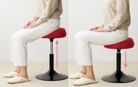 座面はブラウンとレッドの2色を用意。インテリアに自然と馴染むデザインで、トレーニング用途としてはもちろん、ダイニングでの使用や台所作業、パソコン作業用などの椅子としても活用いただけます。