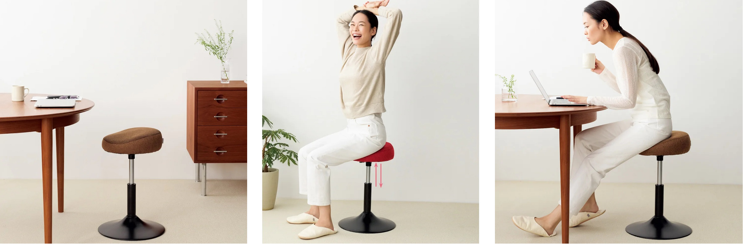 座面はブラウンとレッドの2色を用意。インテリアに自然と馴染むデザインで、トレーニング用途としてはもちろん、ダイニングでの使用や台所作業、パソコン作業用などの椅子としても活用いただけます。