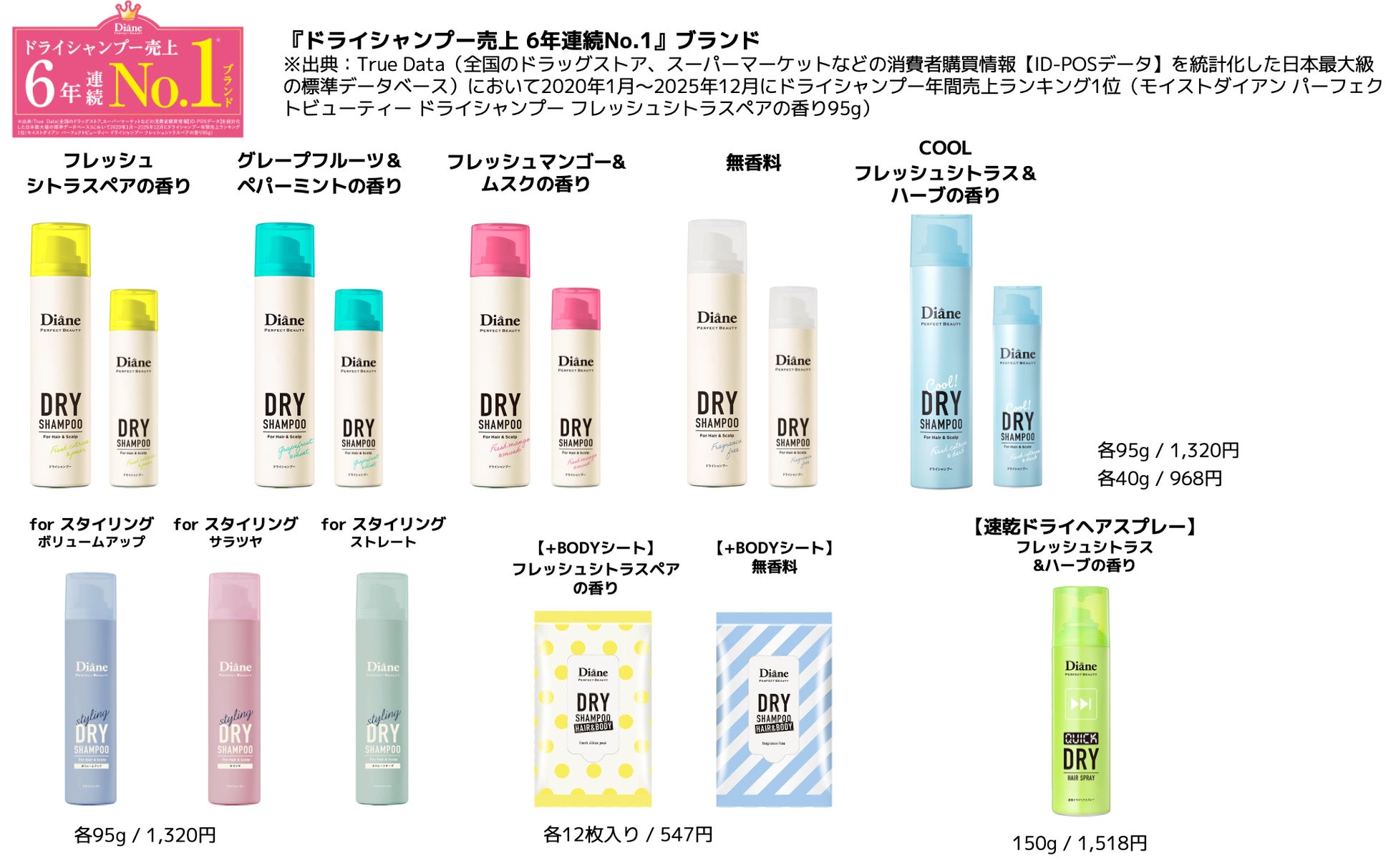 ※出典:True Data(全国のドラッグストア、スーパーマーケットなどの消費者購買情報【ID-POSデータ】を統計化した日本最大級の標準データベース)において2020年1月~2025年12月にドライシャンプー年間売上ランキング1位(モイストダイアン パーフェクトビューティー ドライシャンプー フレッシュシトラスペアの香り95g)