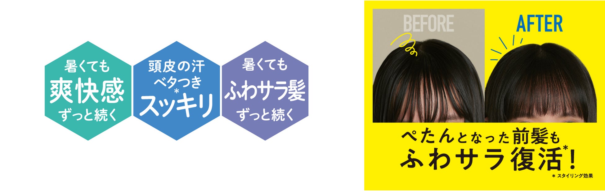¹ 皮脂吸着パウダーによる ² 香りによる(無香料を除く) *³ スタイリング効果