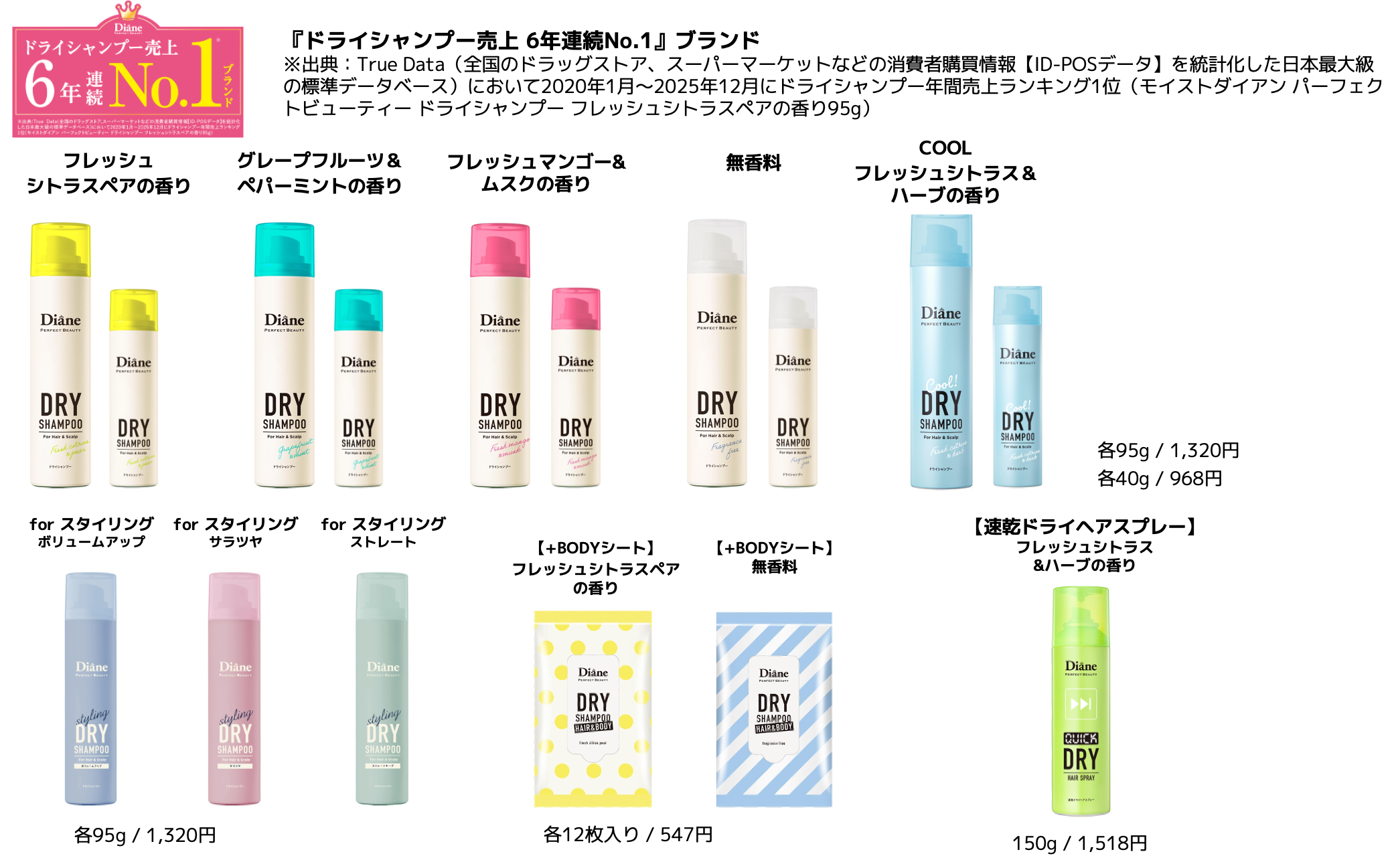 ※出典:True Data(全国のドラッグストア、スーパーマーケットなどの消費者購買情報【ID-POSデータ】を統計化した日本最大級の標準データベース)において2020年1月~2025年12月にドライシャンプー年間売上ランキング1位(モイストダイアン パーフェクトビューティー ドライシャンプー フレッシュシトラスペアの香り95g)