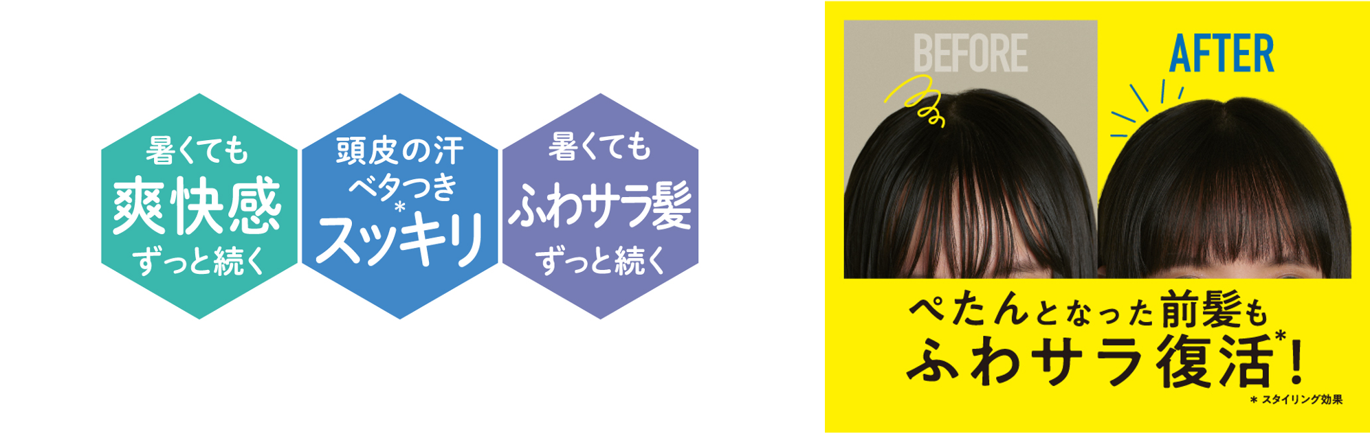 ¹ 皮脂吸着パウダーによる ² 香りによる(無香料を除く) *³ スタイリング効果