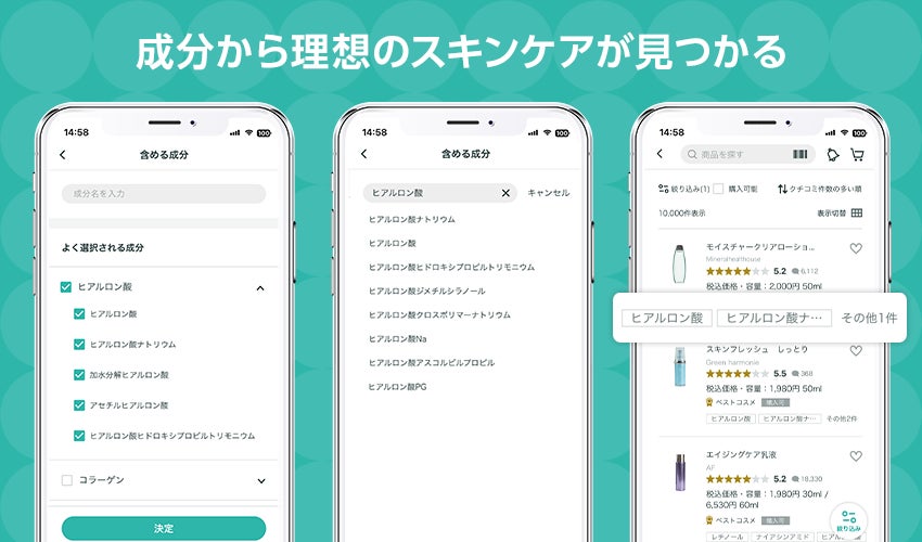 本機能により、生活者は「レチノール」や「アゼライン酸」といった話題の成分を含む商品や、特定の成分が入っていない商品を検索し、従来のクチコミランキングをはじめとした検索方法だけでは出会えなかった商品と出会うことが可能となります。
