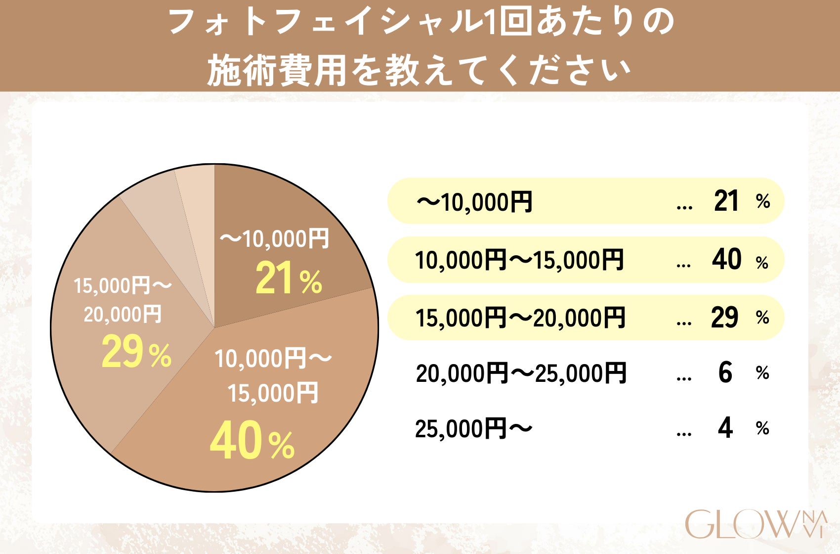 フォトフェイシャル1回あたりにかかった費用は、「10,000円~15,000円」という回答が40%で最も多い結果でした。