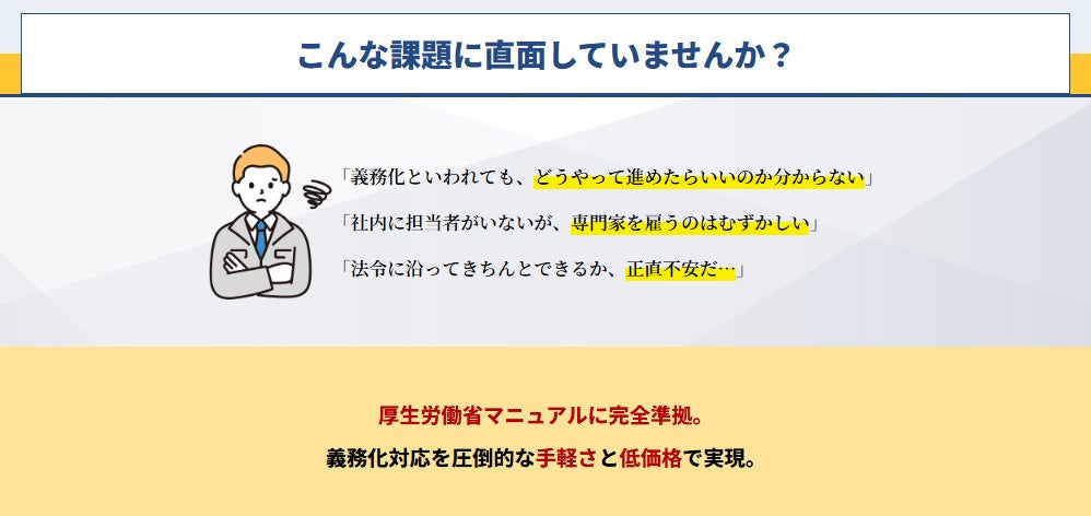 担当者の負担を最小限に抑え、毎年確実に義務を果たせるサービスを目指しています。
