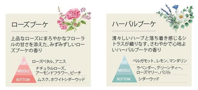上品なローズにまろやかなフローラルの甘さを添えた、みずみずしいローズブーケの香り