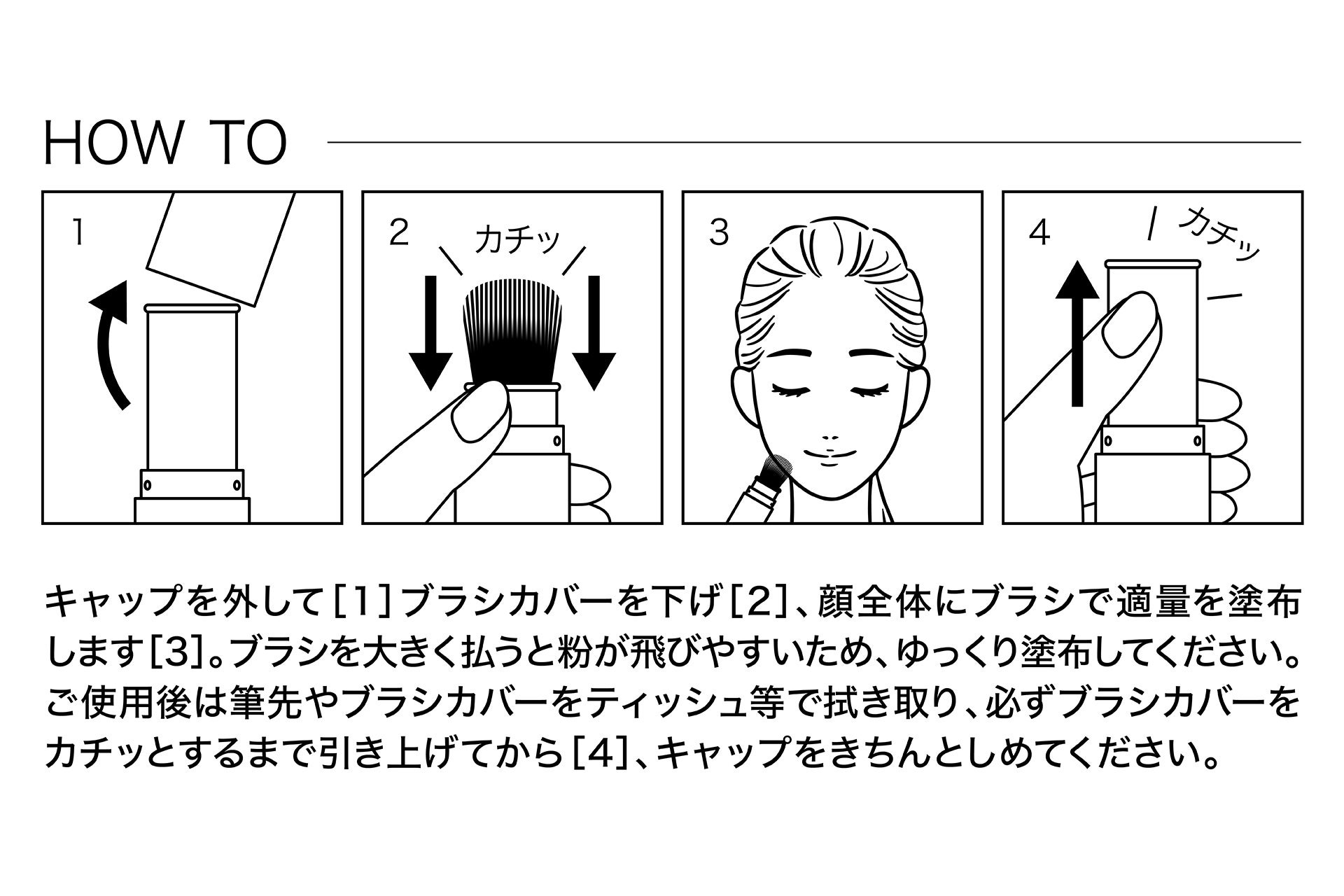 使い始めや粉が出にくいときは、ティッシュ等にブラシをトントンと当て、筆先にパウダーを含ませてください。
