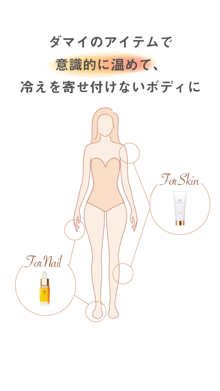 こうした季節特有の悩みに寄り添うため、本キャンペーンでは「温め巡り排出」に着目した『ダマイ セルリファーム ボディクリーム+ダマイ サーマル フィト ネイルセラム』での「温活×保湿ケア」をご提案いたします。