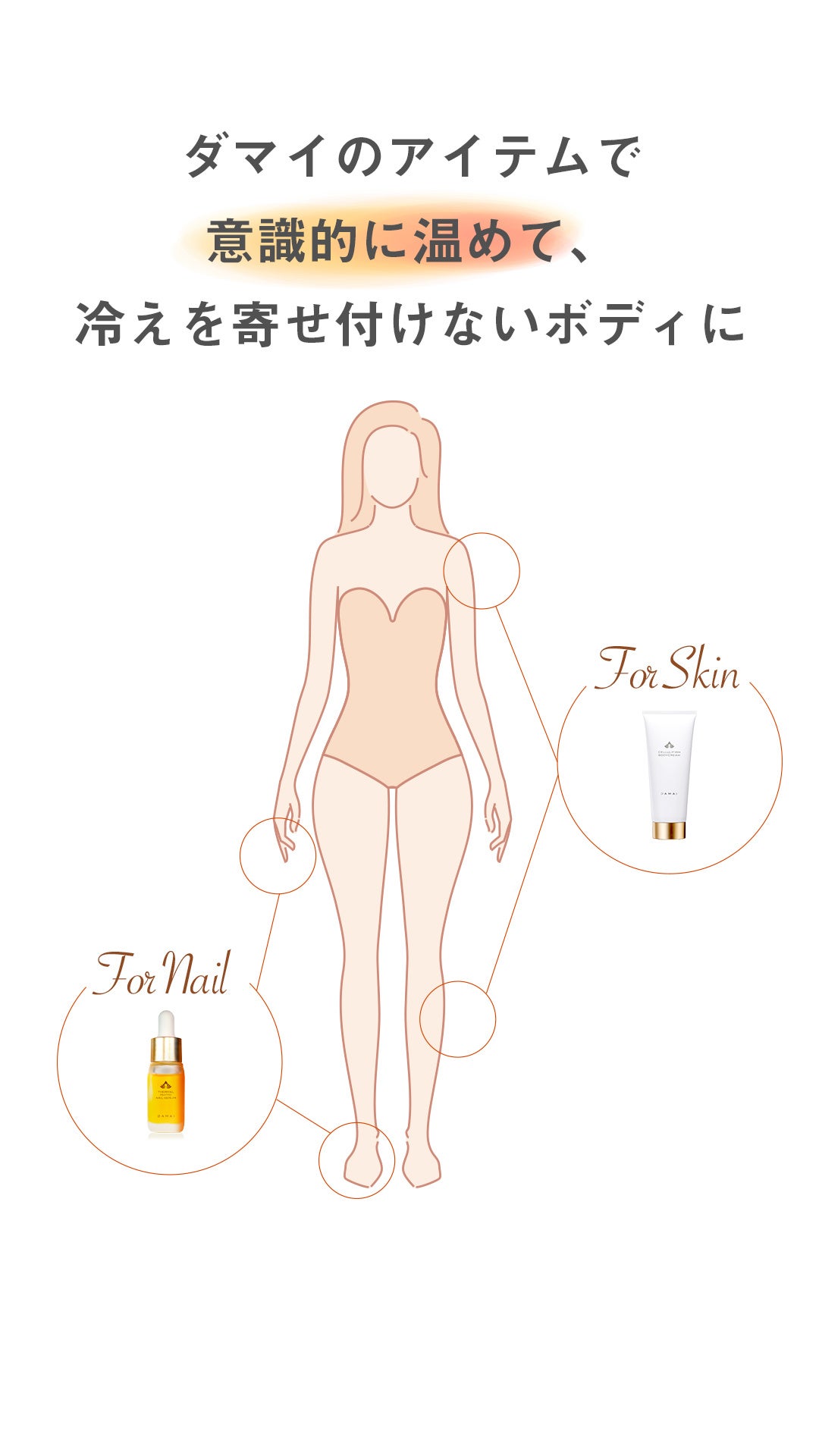 こうした季節特有の悩みに寄り添うため、本キャンペーンでは「温め巡り排出」に着目した『ダマイ セルリファーム ボディクリーム+ダマイ サーマル フィト ネイルセラム』での「温活×保湿ケア」をご提案いたします。