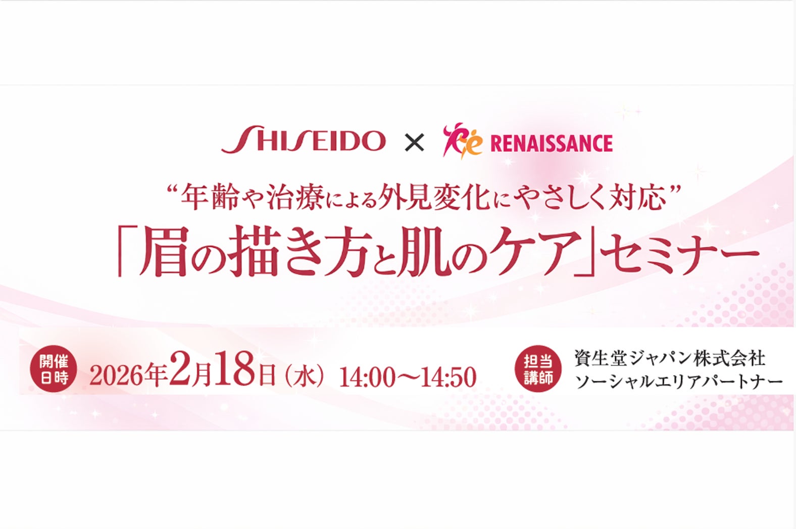 株式会社ルネサンス(本社:東京都墨田区、代表取締役社長執行役員:望月 美佐緒、以下「当社」)は、当社が取り組む「がん患者のQOL(クオリティー・オブ・ライフ=生活の質)を高めるためのがん患者支援」の一環として、資生堂ジャパン株式会社(以下「資生堂」)が実施する「資生堂ライフクオリティー ビューティー活動」と連携し、2026年2月18日(水)にセミナーを共催します。がん治療や年齢による肌悩みや肌色の変化に応じたメイクに関する「セルフチェックから始める肌ケア」をテーマにお届けします。
