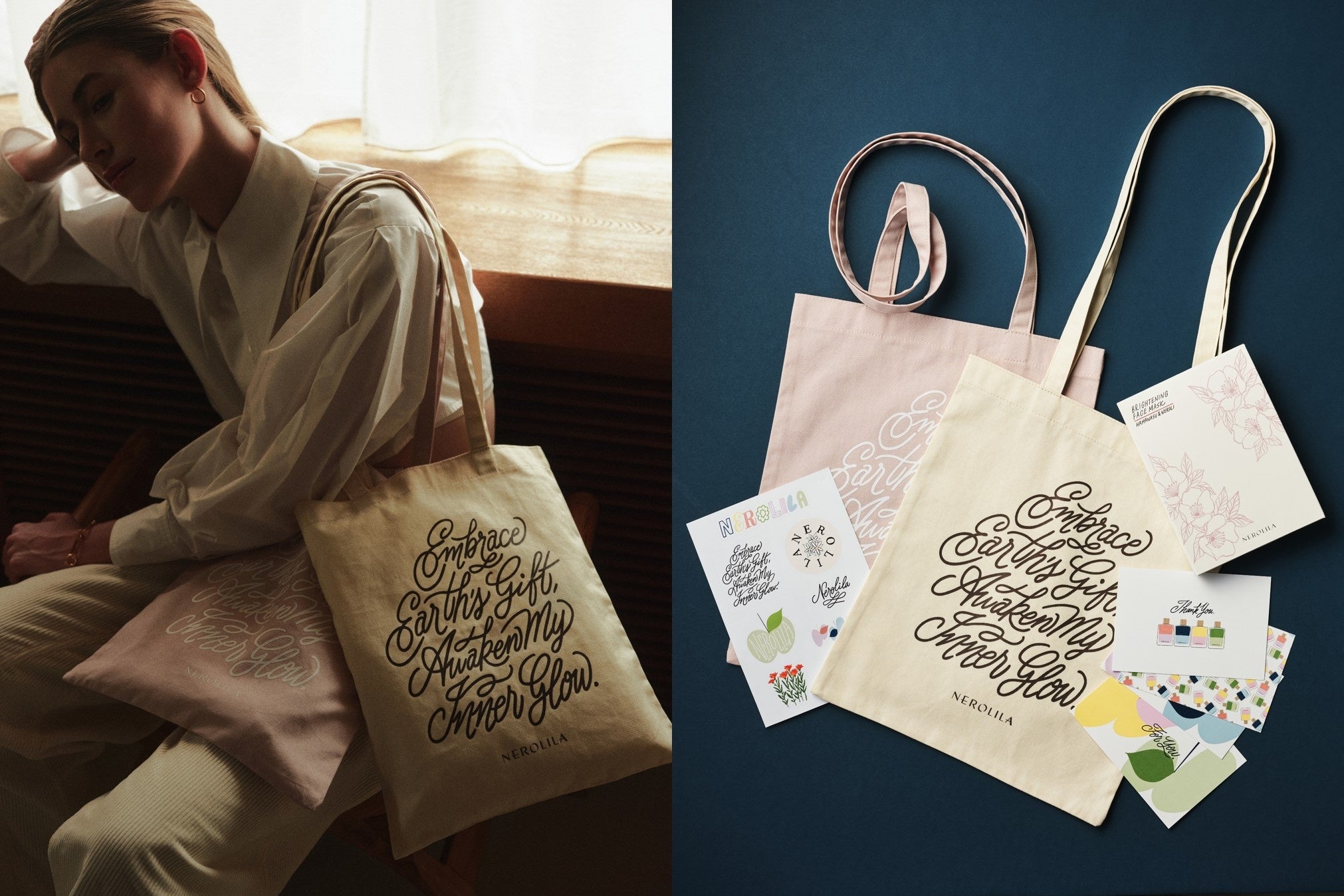 ネロリラのブランドプロミス “Embrace Earth’s gifts, awaken my inner glow「肌が深く満ち 心がほどけるひとときを」” を描き下ろしたトートバッグや、シグネチャーアイテム「ビューティーセラム」などを心ときめくカラフルな色彩であしらったステッカーやポストカードも、スペシャルノベルティとして登場!