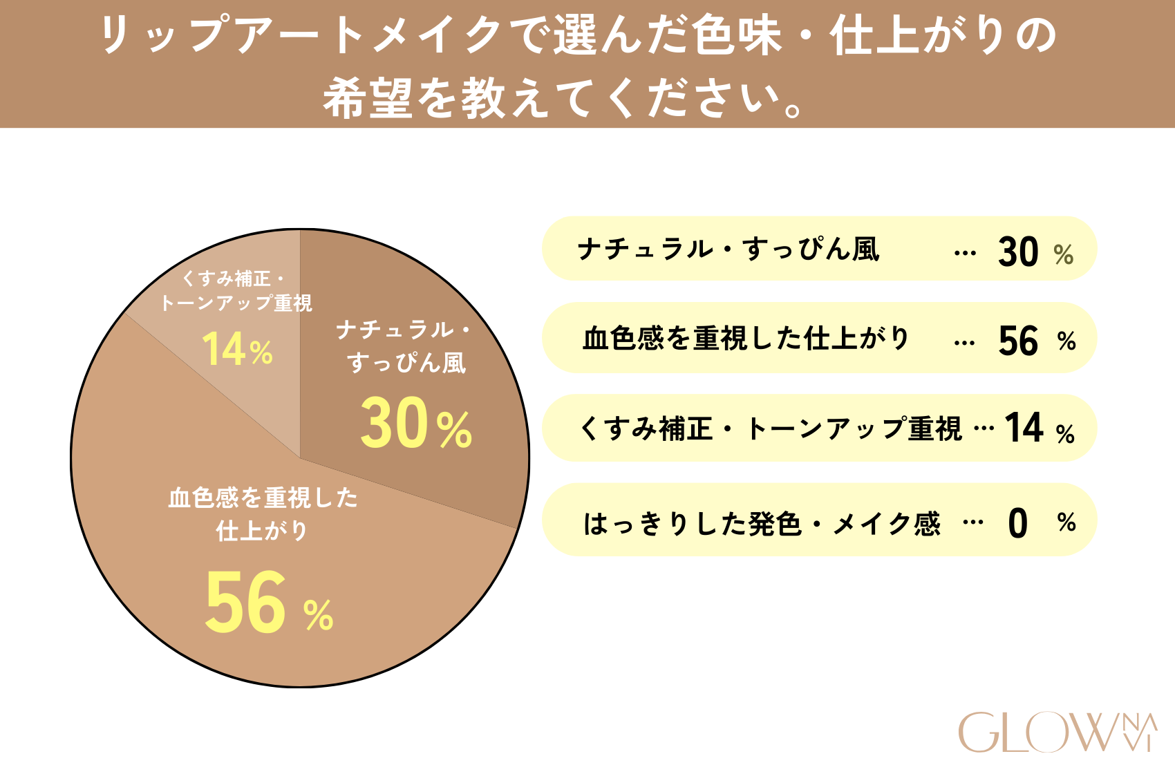 リップアートメイクの仕上がりについては、「血色感を重視した仕上がり」を選択した人が56%で最多でした。