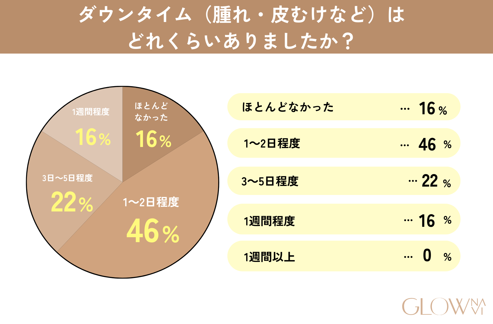 ダウンタイムの期間については、「1~2日程度」が46%で最も多く、「3~5日程度」が22%という結果でした。