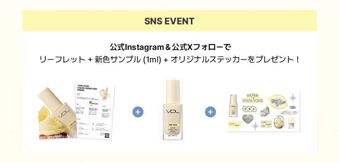 公式Instagram&公式Xフォローでオリジナルステッカーと「VDL トーン ステイン カラー コレクティング プライマー 04 クリーム イエロー」1ml サンプル&リーフレットをプレゼント