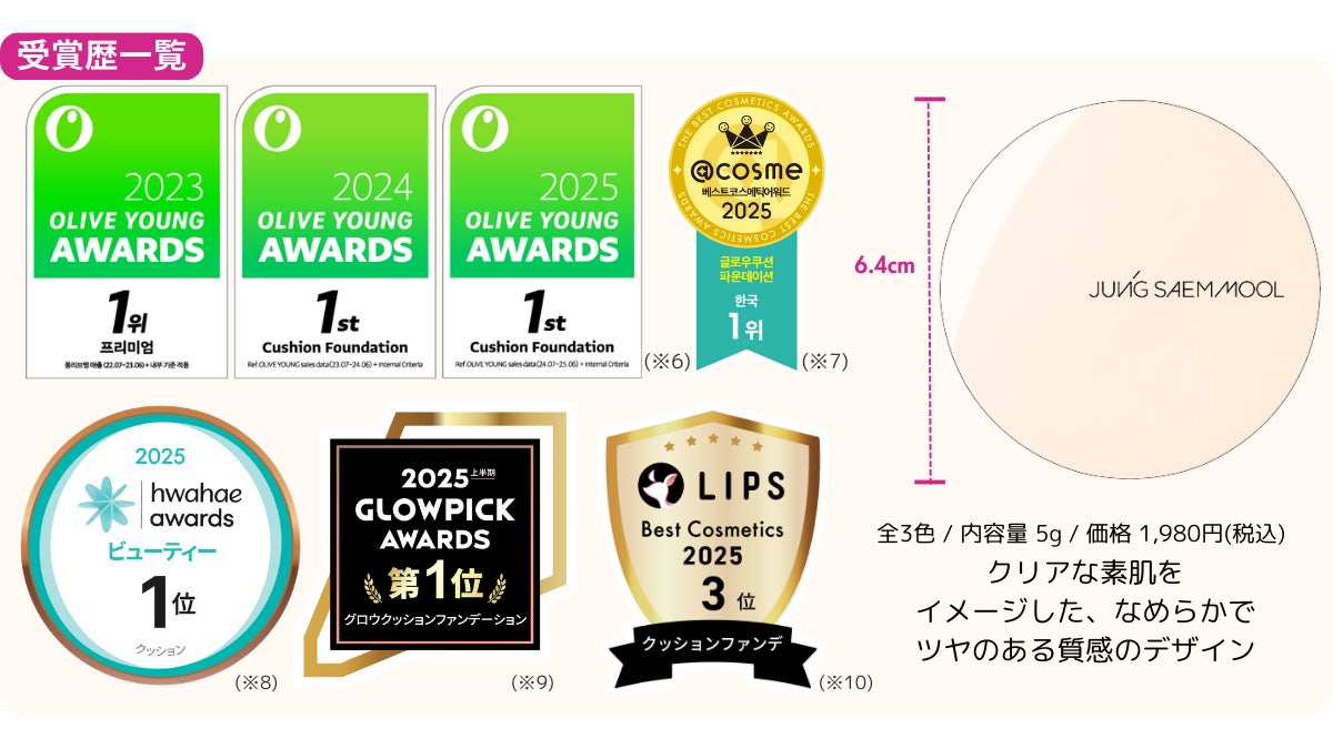 (※7)2025年 アットコスメコリアベストコスメティックアワードグロウファンデーション部門1位受賞(集計期間:24年11月1日~25年10月31日) (※8)2024年 ファヘアワードビューティークッション部門1位受賞(集計期間:24年1月~24年11月)
