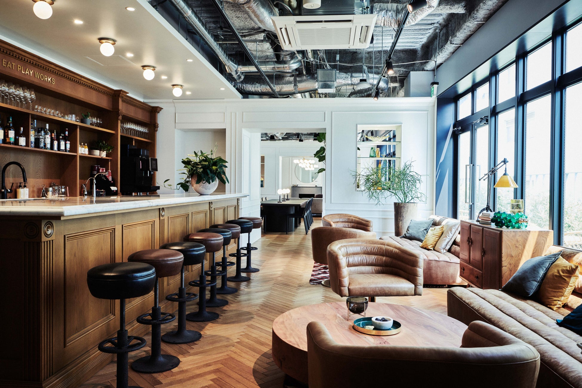 EAT PLAY WORKSは、「食べて」「遊んで」「仕事して」をコンセプトにデザインされた複合施設で、1-2Fは国内外で注目を集める銘店の新業態17 店舗が集結するレストランフロア「THE RESTAURANT」、3-4Fはメンバーとそのゲストのみが利用できる大人のためのメンバーズラウンジ、5-6Fは1名から賃貸可能な完全個室のオフィスフロアです。