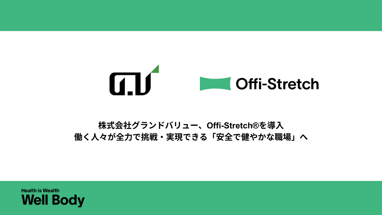 Well Body株式会社(本社:東京都渋谷区、代表取締役:水野 純一・吉村 直途)は、この度、株式会社グランドバリュー(本社:東京都江戸川区、代表取締役:古橋慶樹)の社内福利厚生および健康経営施策の一環として、企業向けフィジカルケアサービス「Offi-Stretch®(オフィストレッチ)」の導入が決定したことをお知らせいたします。