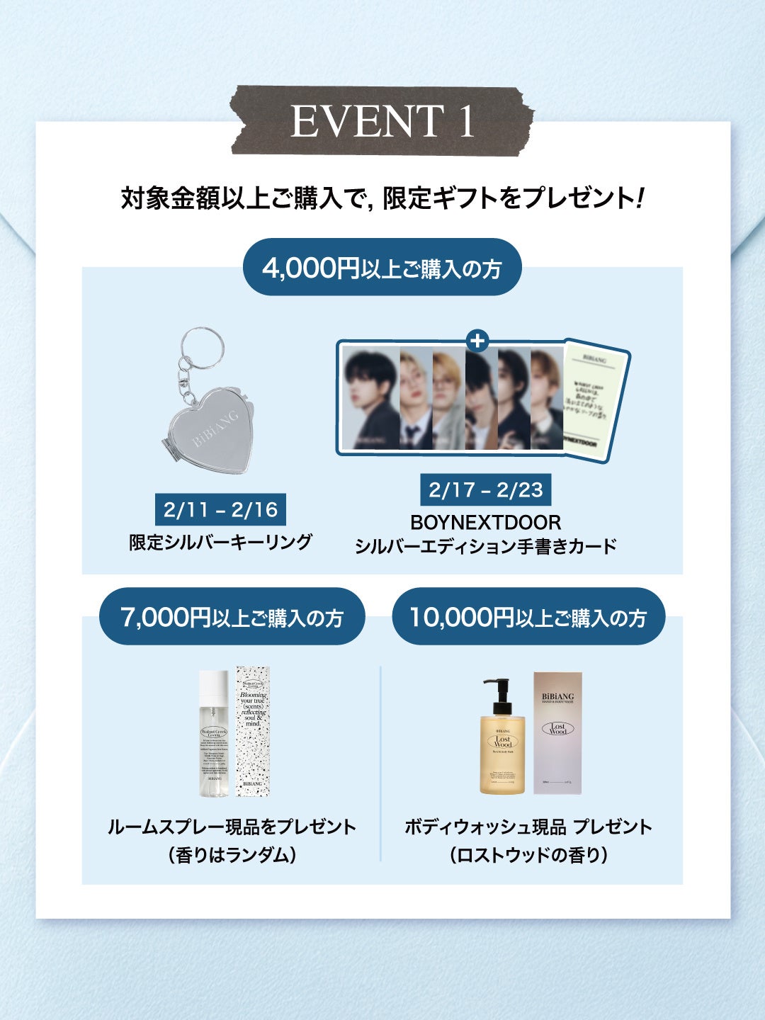 POP UPストアの期間中、ご来場やご購入で限定プレゼントがもらえるスペシャルキャンペーンを開催!ミッション達成で参加できるハズレなしのルーレットや、購入金額に応じた限定アイテムや「BOYNEXTDOOR」直筆メッセージカードなど、ここでしか手に入らない特典が盛りだくさんです。さらに、期間中に店頭でエポスカードに新規入会すると香水のミニサイズもプレゼント!