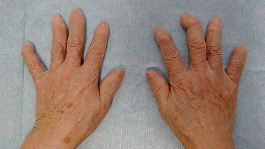 ヘバーデン結節は、手指の第一関節に生じる「変形性関節症」の一種で、主に痛み・腫れ・変形などがみられる疾患です。関節の動かしにくさを伴うこともあり、人によってはミューカスシストと呼ばれる小さなのう腫(水ぶくれのようなもの)ができることもあります。