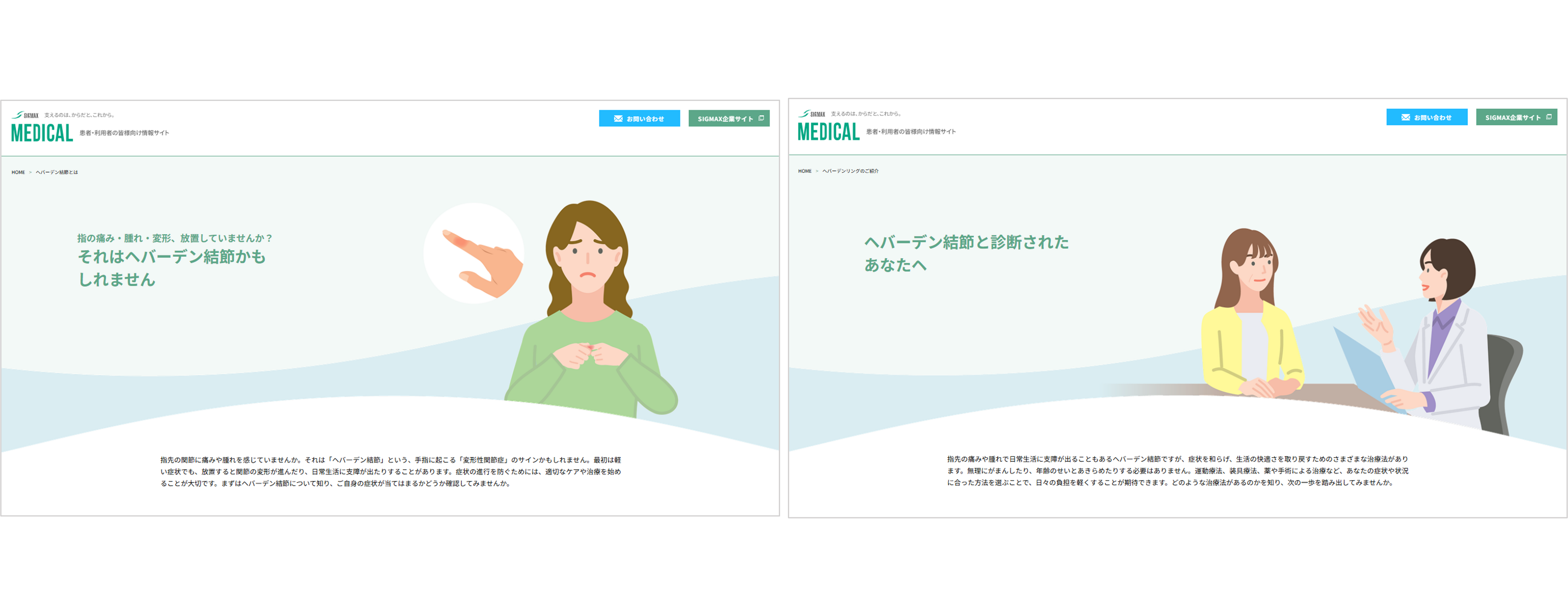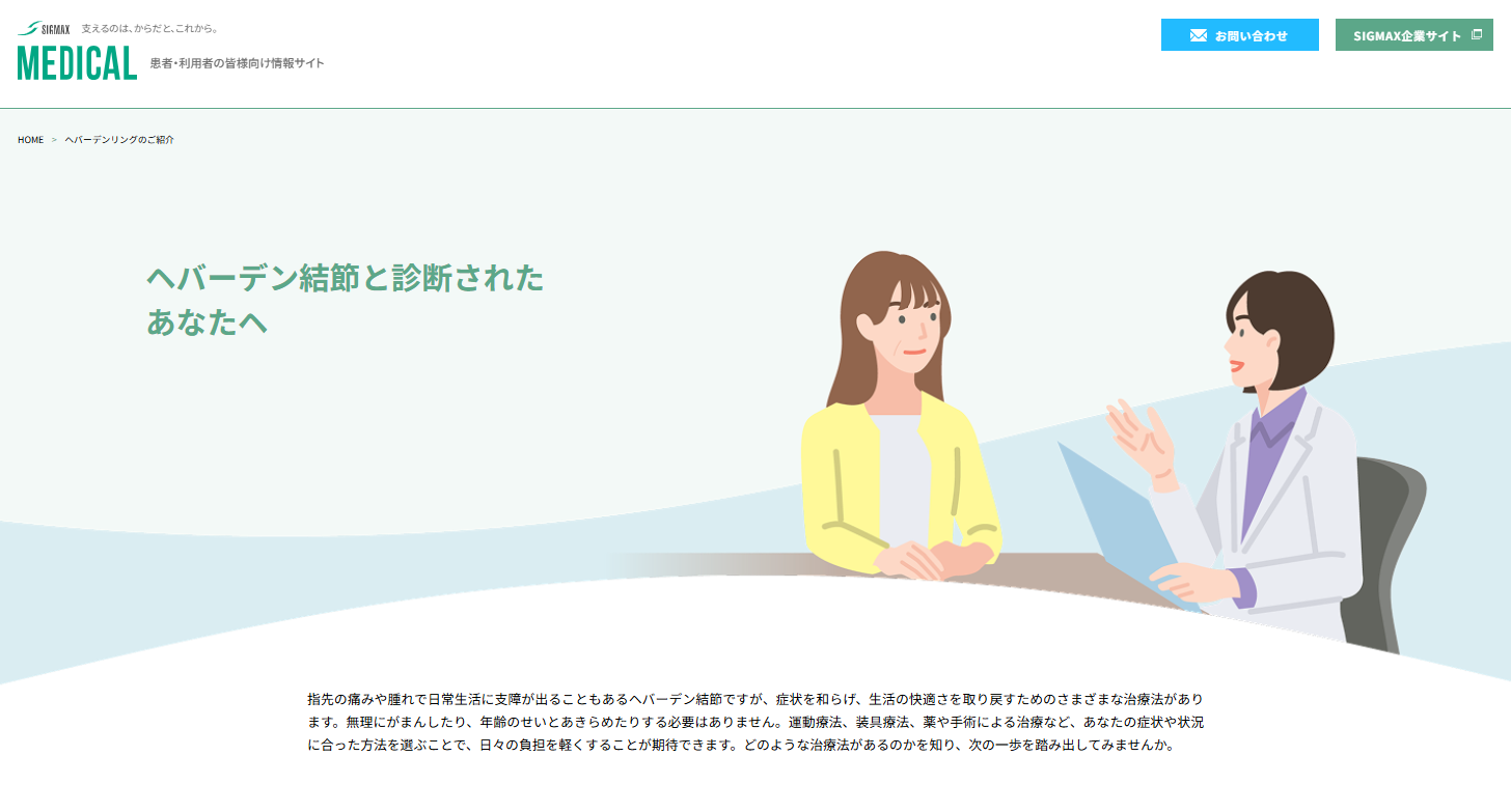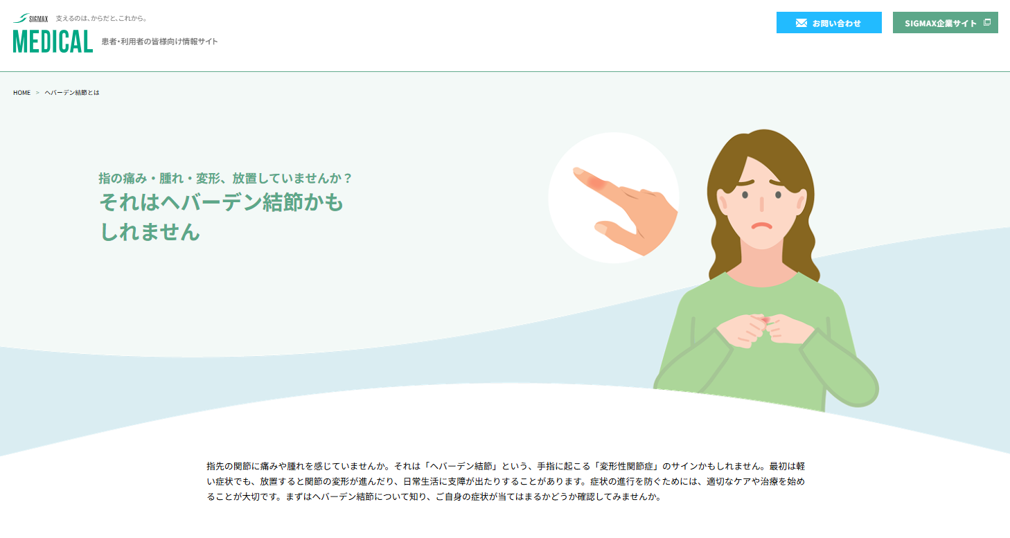 こうした背景を受け、当社が運営している医療関係者・製品利用者向けWEBサイト「SIGMAX MEDICAL」にて、患者様が適切な受診・相談につながるよう、ヘバーデン結節に関する一般的な疾患情報をまとめたページを新設しました。
