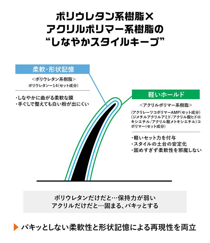 スタイルキープをサポート:柔軟性と形状記憶力を兼ね備えた樹脂※1と、軽いホールド力を持つ樹脂※2をバランスよく配合することで、柔軟性と軽いキープ力を両立。パキッと固めすぎることなく、自然な質感を保ったままスタイルをキープします。