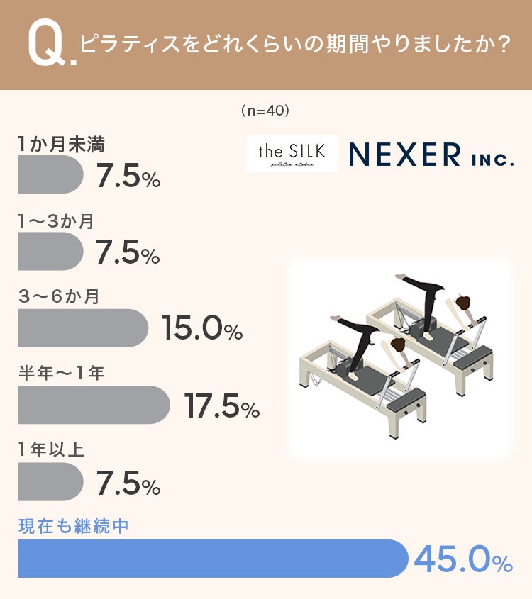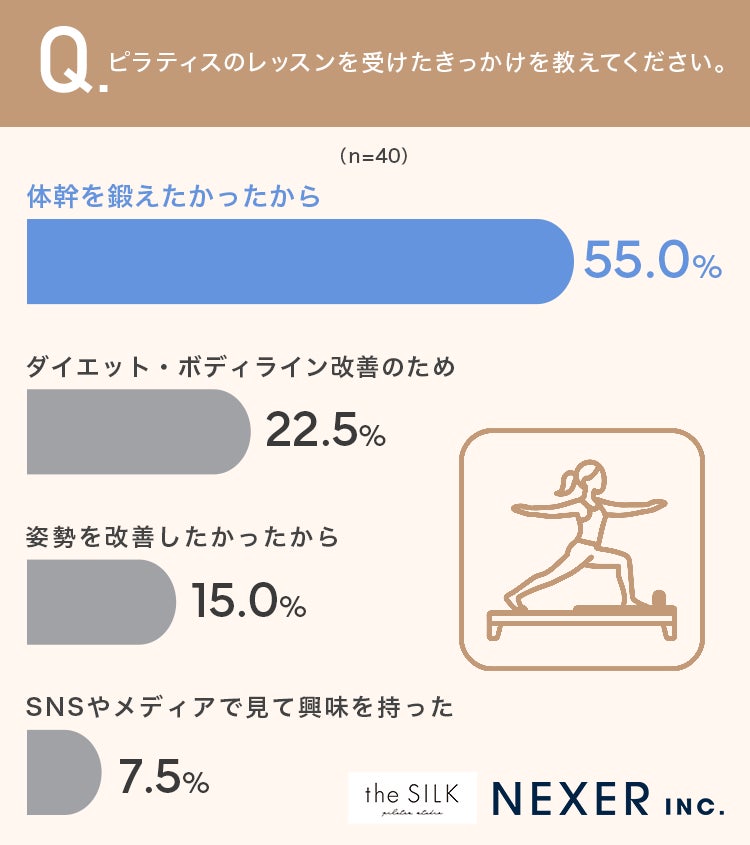 ということで今回は、マシン専門ピラティススタジオ『the SILK(ザ シルク)』と共同で、事前調査で「ピラティスのレッスンを受けたことがある」と回答した女性40名を対象に「ピラティスに関するアンケート」をおこないました。