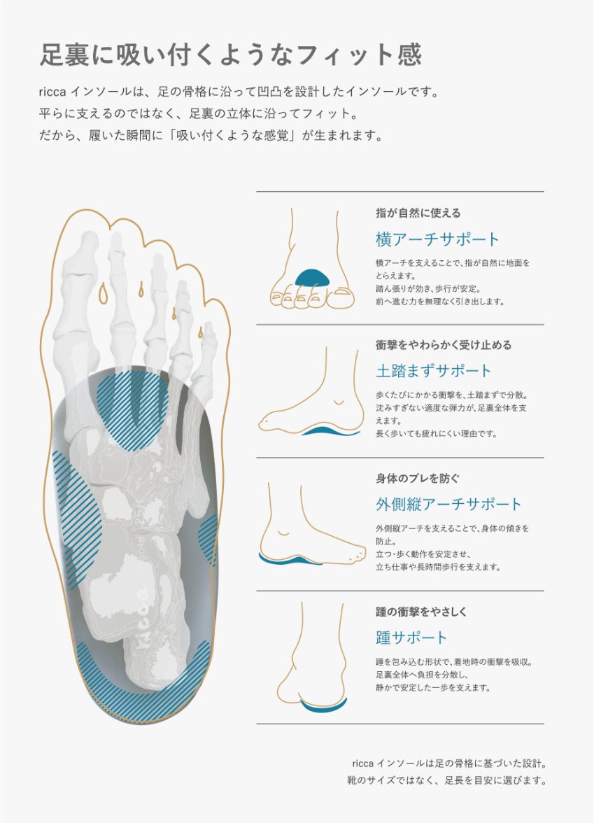 riccaは、足を平面的に支えるのではなく、足裏の立体構造に沿って設計したインソールです。横アーチ・縦アーチ・踵を支える独自構造により、足裏に吸い付くようなフィット感を実現しています。