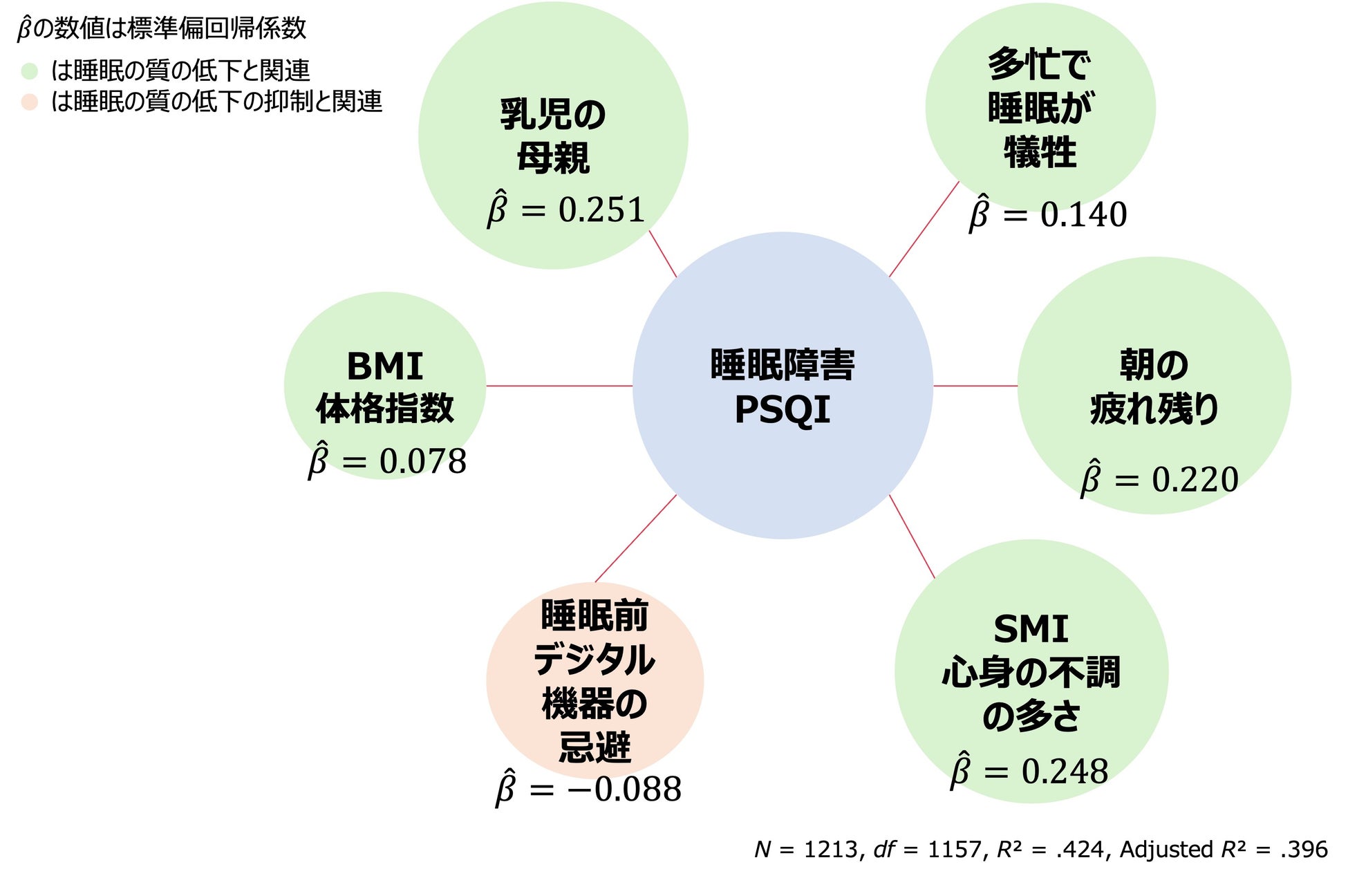 PSQI総得点を説明する重回帰分析の結果では、「乳児の母親であること」や「心身の不調(SMI)の多さ」、「起床時の疲労感の頻度」は、睡眠の質の低下と強い関連が見られました。また、「忙しさによる睡眠の犠牲」、「体格指数(BMI)」の高さも、睡眠の質の低下と有意に関連していました。一方、「就寝前に電子端末(スマホ等)の使用を避ける」頻度の高さは、睡眠の質が良好であること(質の低下の抑制)と関連していました。
