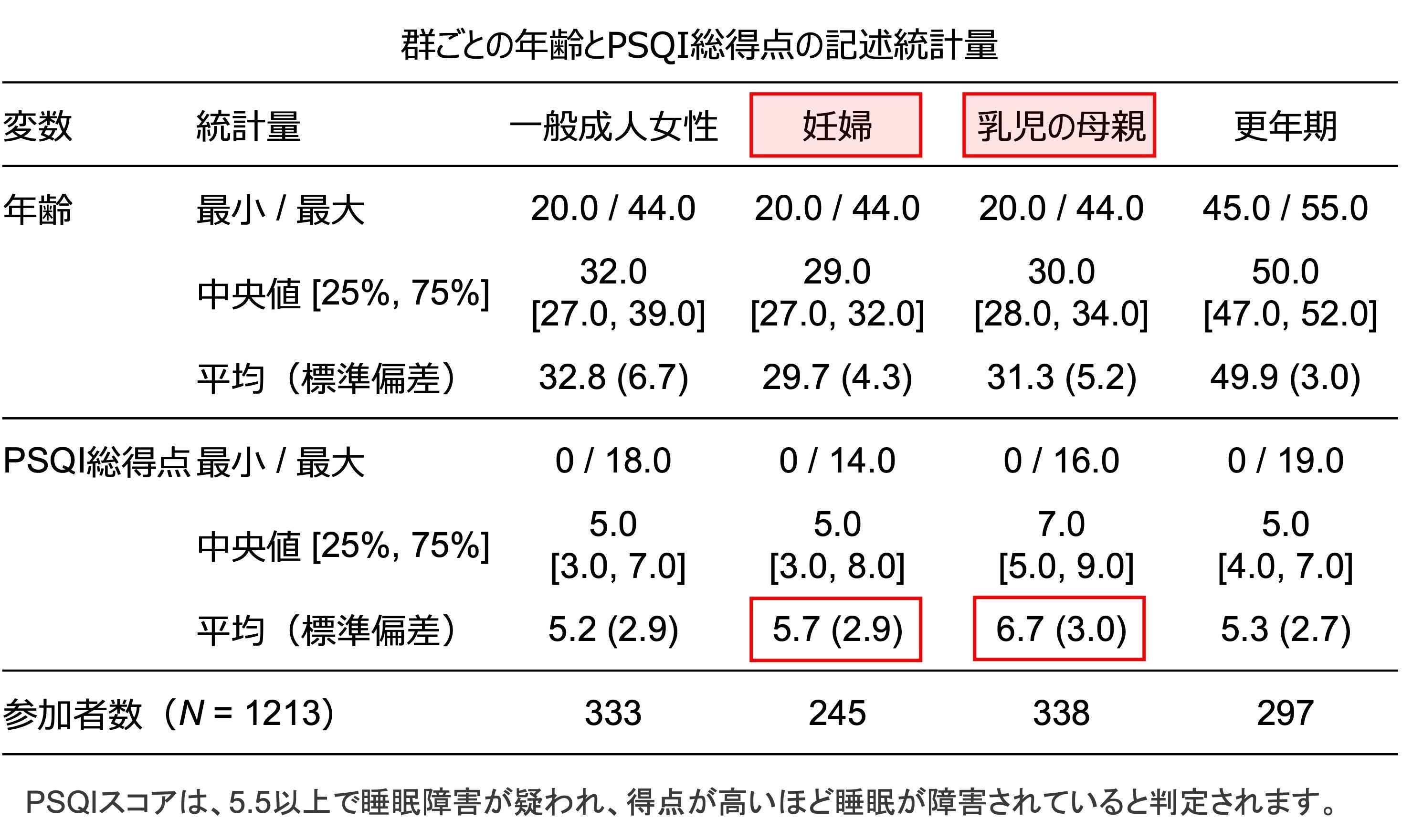 女性のライフステージの中で最もPSQIの得点が高いのは、生後12か月以下の乳児を養育中の母親でした。次に妊娠期であり、妊娠期・子育て期の母親への睡眠ケアが大きな課題であることが明らかとなりました。