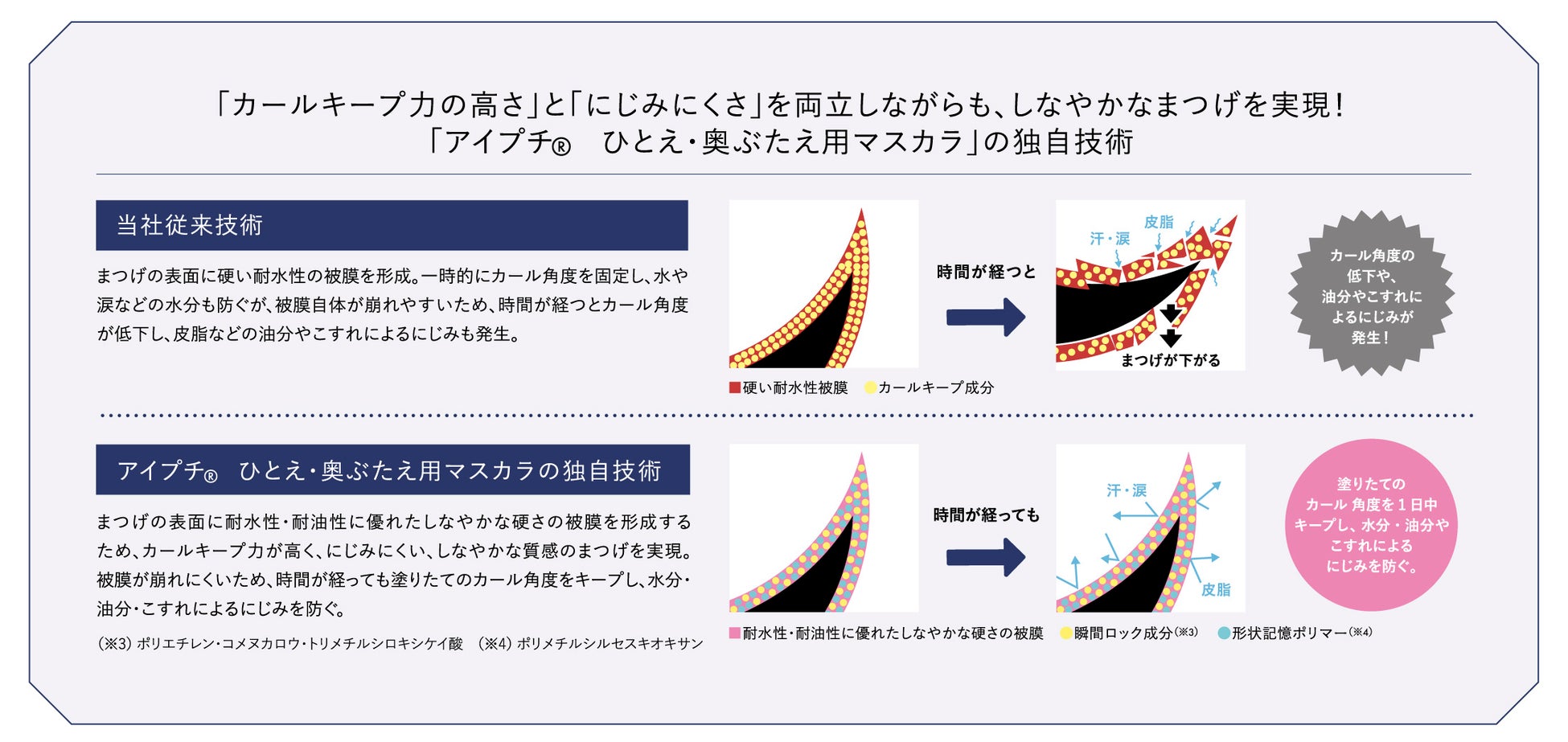 独自技術により、まつげの表面に耐水性・耐油性に優れた被膜を形成。「カールキープ力の高さ」と「にじみにくさ」を両立しながらも、しなやかな質感のまつげを実現しました。