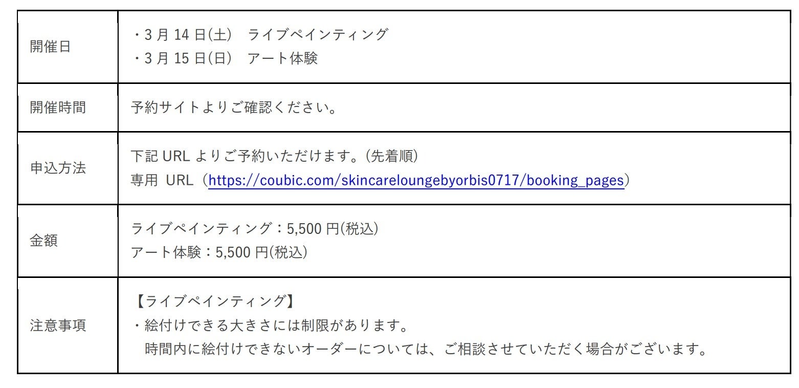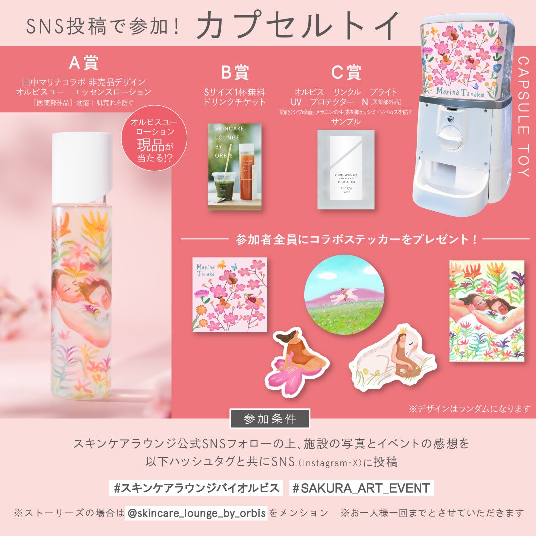 オルビス株式会社(本社:東京都品川区、代表取締役社長:山口 裕絵)のブランド初となる体験特化型施設 『SKINCARE LOUNGE BY ORBIS』は、2026 年 2 月 20 日(金)から 2026 年 4 月 19 日(日)の期間、桜をテーマに 2 名のアーティストとコラボレーションを行うイベント「SAKURA ART EVENT」を開催いたします。2026 年 2 月 20 日(金)から 2026 年 3 月 19 日(木)の第一弾では、北海道出身のアーティスト田中マリナさんとのコラボレーションを行います。また、2026 年 3 月 20 日(金)から 2026 年 4 月 19 日(日)の第二弾では、4 人組バンド CHAI の元メンバーで作家・アーティストとして活動している YUUKI さんとコラボレーションいたします。第一弾では『オルビス ユー エッセンスローション』のオリジナルつめかえ用ボトルが作れる『CREATE BOTTLE』のサービスに、コラボデザインのオリジナルデザインボトル 2 種が登場。『JUICE BAR』では桜をイメージしたドリンクを期間限定で販売します。また、3/14(土)と 3/15(日)には、田中マリナさんによるワークショップを開催。田中マリナさんが世界に一つだけの絵を巾着にその場で絵付けをするライブペインティングと、田中マリナさんアドバイスのもとキャンバスに絵を描く体験をするアート体験のワークショップを実施いたします。