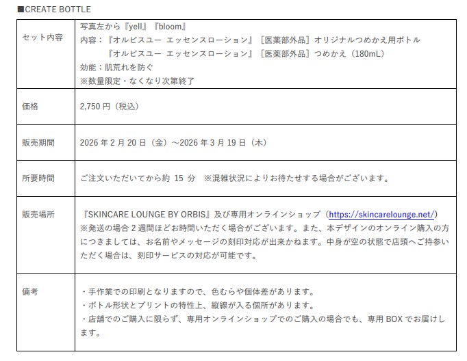 『SKINCARE LOUNGE BY ORBIS』限定サービスとしてご好評いただいている 『CREATE BOTTLE』は、『オルビスユー エッセンスローション』のつめかえ用ボトルに、お好みのキャップカラーとデザインが選択でき、お名前やメッセージの印字が可能です。