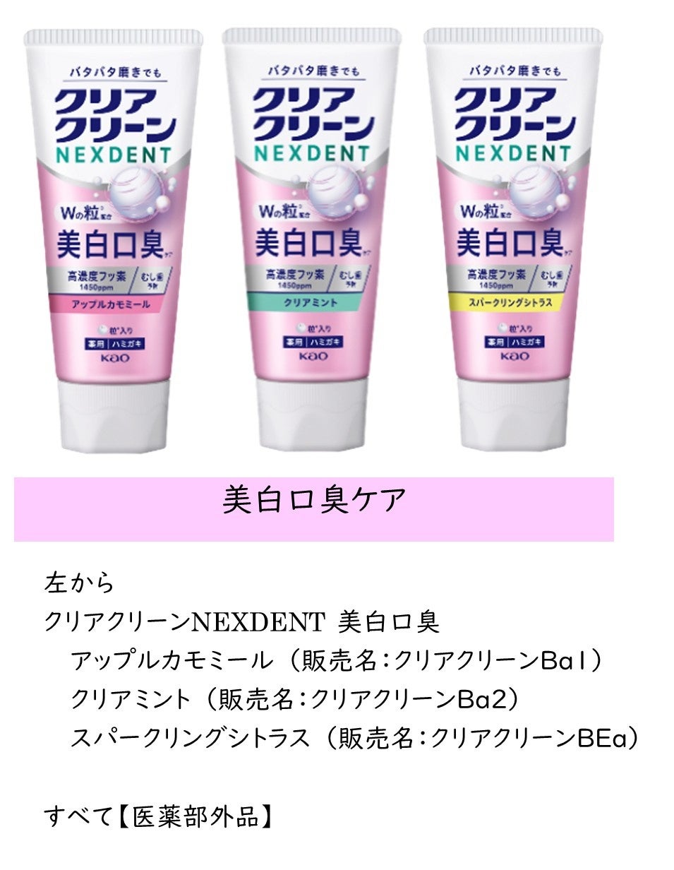 レギュラータイプに加え、美白口臭ケアもできる「クリアクリーンNEXDENT 美白口臭ケア」【医薬部外品】も同時発売します。3種の香味(アップルカモミール、クリアミント、スパークリングシトラス)で展開します。
