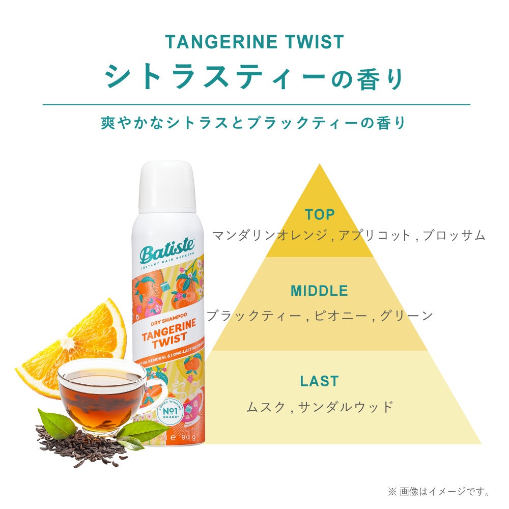 世界90か国以上※1で販売されているドライシャンプーブランドが独自開発した新フレグランスを世界最速で発売します。弾けるようなシトラスに落ち着くブラックティーの香りをプラスしたシトラスティーの香りです。「バティスト ドライシャンプー タンジェリンツイスト」で髪質※2も気分もアップデートしませんか。