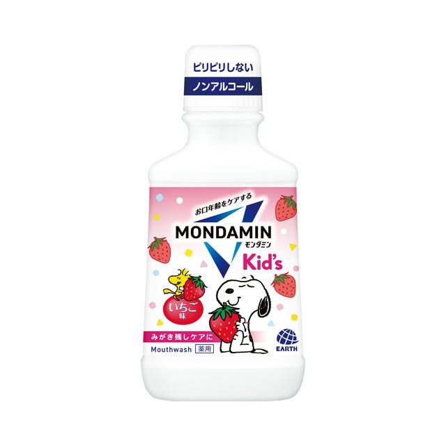 幅広い世代に愛されている『PEANUTS』のキャラクター、スヌーピーとウッドストックをパッケージデザインに採用し、洗口液を使うお子様が楽しくなるようなポップで可愛らしいパッケージデザインに仕上げました。「ぶどう味」、「いちご味」それぞれの香味で違ったデザインをお楽しみいただけます。