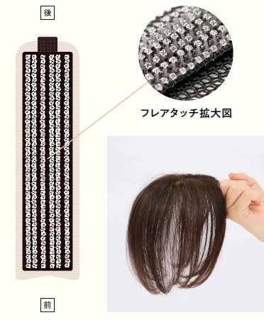 ウィッグの上から軽く押さえてとめる「フレアタッチ」を採用。自髪と絡むことでしっかりフィット。重さ10g以下の軽量ウィッグです。