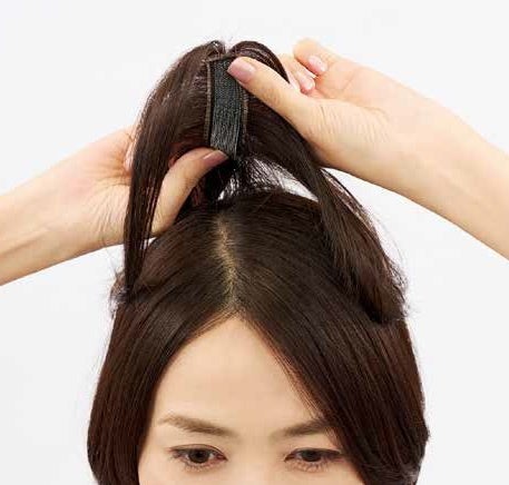 ウィッグの上から軽く押さえてとめる「フレアタッチ」を採用。自髪と絡むことでしっかりフィット。重さ10g以下の軽量ウィッグです。
