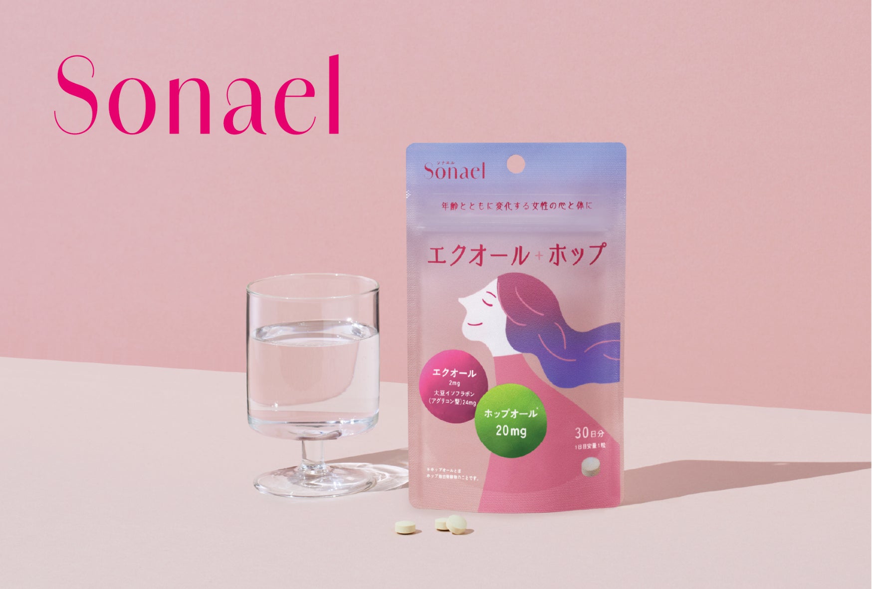 スマートフェムケアブランド「Sonael(ソナエル)」 年齢を重ね心とカラダの変化を感じはじめた女性のための、日本初*1、エクオール×ホップ由来の「ホップオール*2」× 大豆イソフラボンの3成分を独自配合したサプリ。大人女性特有のトゲトゲ・どんより・モヤモヤなどの“ゆらぎ”をサポートし、明るく前向きな毎日へ。