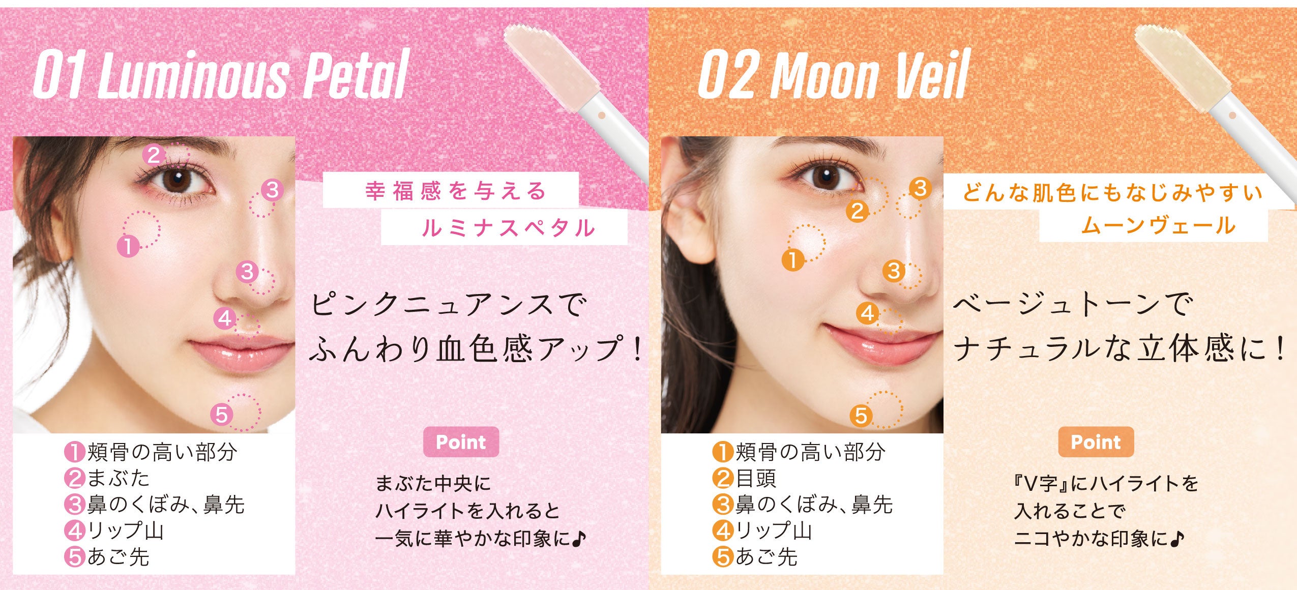01 ルミナスペタル:ピンクニュアンスの光で内側からにじむような血色感をプラスし、多幸感ある艶肌に。
