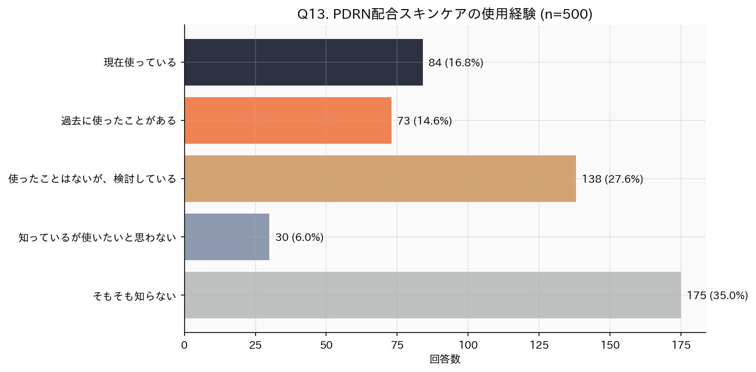 実際、PDRNを知っている人から実際に使用した人への転換率は約37%にとどまります。一方、使用者の効果実感率は84%と極めて高く、「一度試せば定着する」構造です。