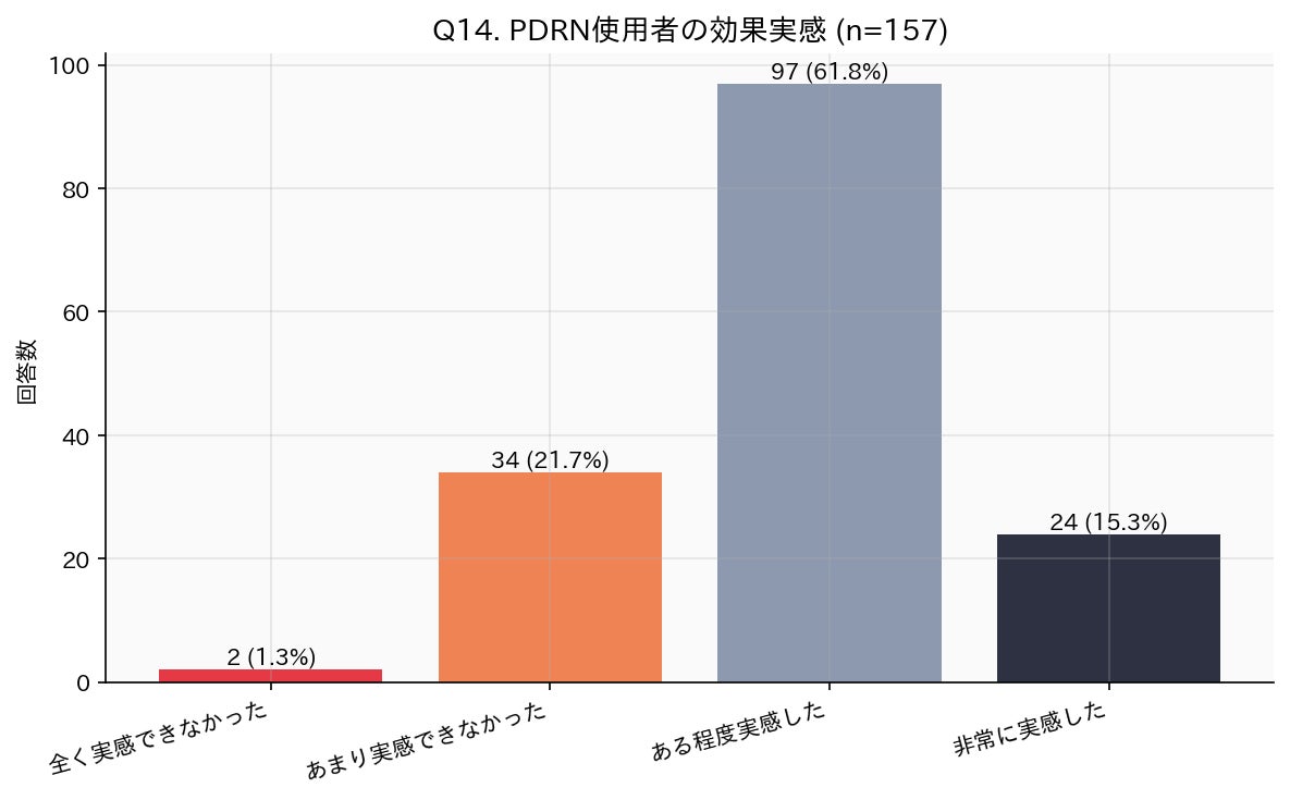 ・PDRN使用経験者の84.3%が効果を実感 — 「非常に実感した」21.5%+「ある程度実感した」62.8%