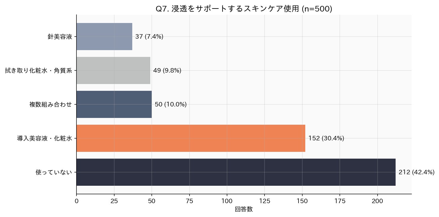 導入美容液や針美容液など浸透をサポートするスキンケアについて、何かしら使用している人が69.8%に達しました。「導入美容液・化粧水を使っている」が42.6%で最多です。