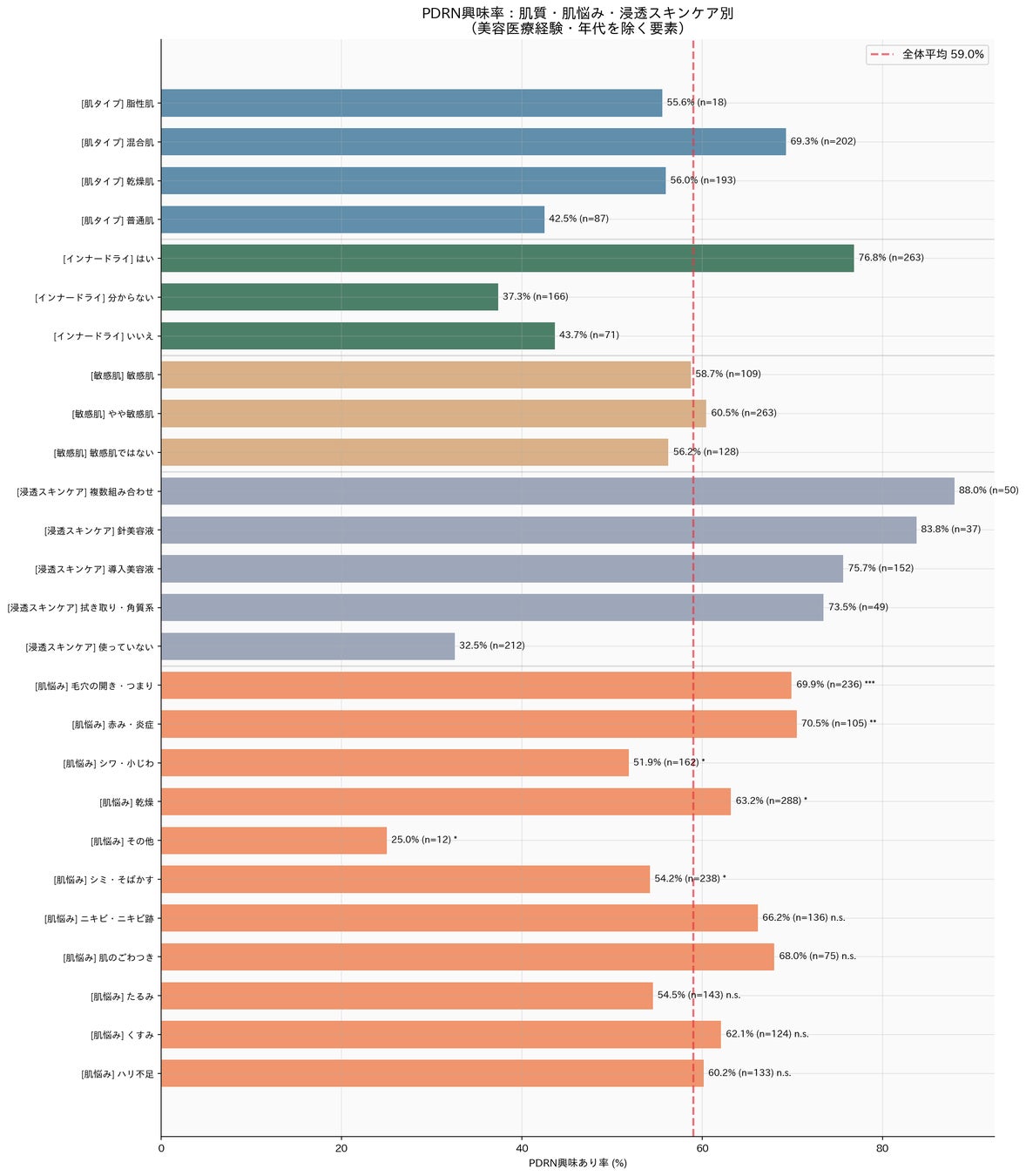 一方、シワ・小じわ悩みはPDRN興味率と負の関連(-10.6pp, p=.031)を示しました。これはシワ悩みが高年齢層に集中し、この層のPDRN認知自体が低いことが背景にあると考えられます。
