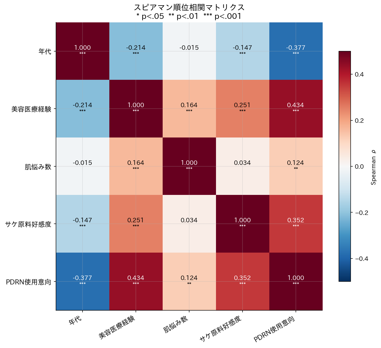 相関分析の結果、美容医療経験×PDRN使用意向のスピアマン順位相関はρ=.434(p<.001)で、全変数中最も強い正の相関を示しました。また、美容医療・年代を除外したロジスティック回帰では、浸透スキンケア使用がオッズ比(OR)3.6〜5.2で最大の予測因子となりました。