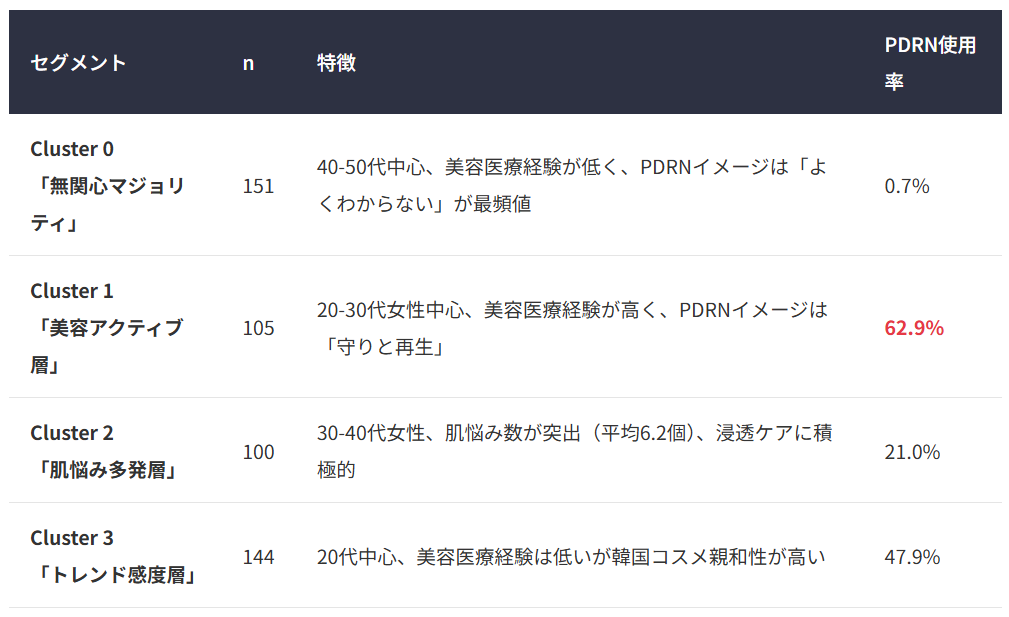 年代・美容医療経験・肌悩み数・サケ原料好感度・PDRN使用意向の5変数を用いたK-Meansクラスター分析の結果、消費者は4つのセグメントに分類されました。