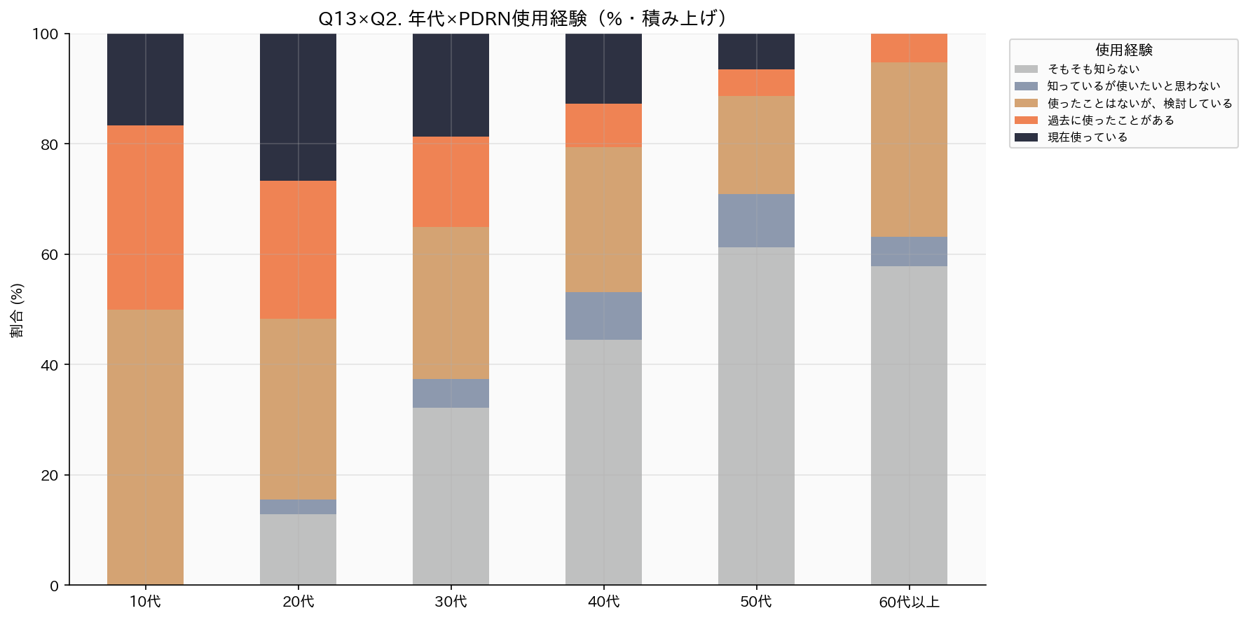 年代別に見ると、20代の「現在使用中」率が22.2%と全年代で最も高い一方、50代以上では「そもそも知らない」が過半数を超えました(カイ二乗検定 χ²=82.27, p<.001)。PDRNの認知は年代によって大きく異なります。