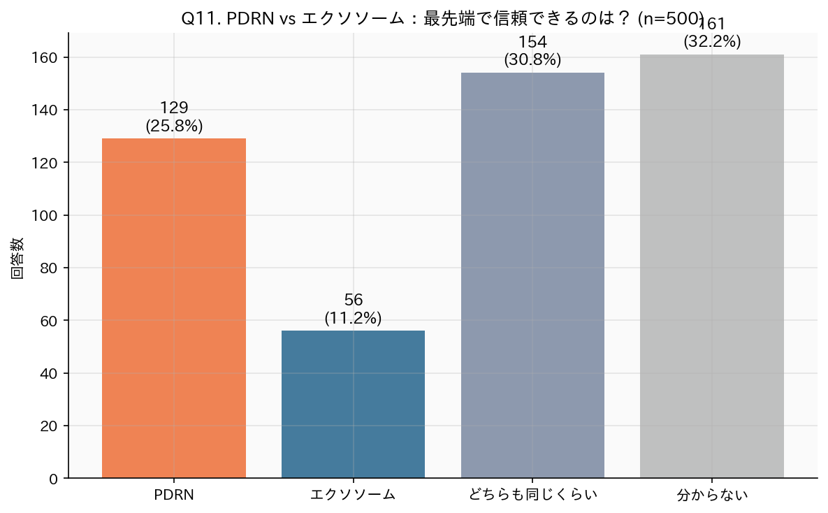 ・PDRNはエクソソームを上回る信頼感 — 「最先端で信頼できる」でPDRN 27.6% vs エクソソーム 19.6%