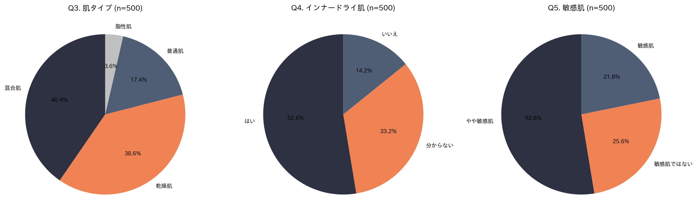 肌質に関する分析では、インナードライ肌「はい」と答えた人のPDRN興味率が76.8%に対し、「分からない」は37.3%と39.5ppの開きがありました(χ²=73.54, p<.001)。一方、敏感肌の自覚はPDRN興味と統計的な関連が見られませんでした(p=.728)。